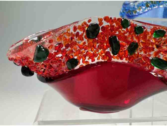 This vibrant trio of handblown glass votive holders showcases the artistry and imagination of Kela’s Glass Gallery of Kapa‘a, Hawai‘i. Each piece is uniquely crafted, with undulating, sculptural rims and richly colored bodies enhanced by flecks of contrasting glass.