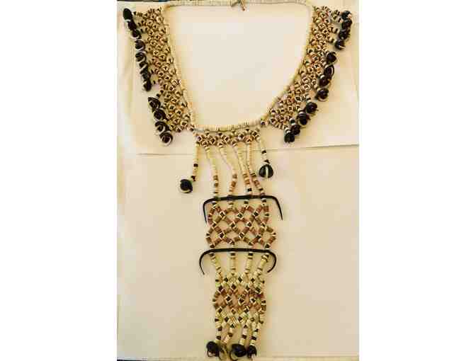 Made from New Guinea shells and coconut shells, this necklace is 17” long and celebrates the artistry of New Guinea.