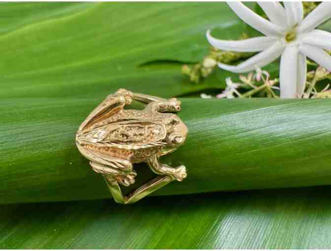 This charming 14K gold ring features a beautifully detailed frog gracefully poised atop a split shank band. The sculpted texture captures the lifelike essence of the frog’s form — from its smooth limbs to the finely worked back — symbolizing renewal, transformation, and good fortune.