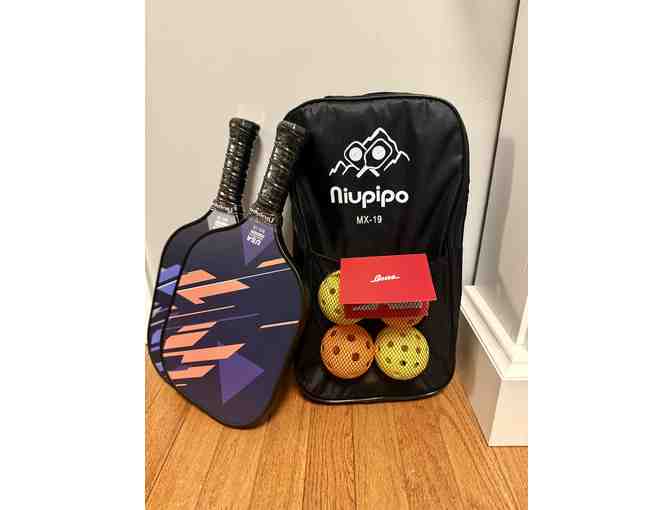 Enjoy a game of pickleball! This set includes two pickleball paddles with a carrying case, 4 pickleballs, and a $50 gift card to Bosse at the Natick Mall.