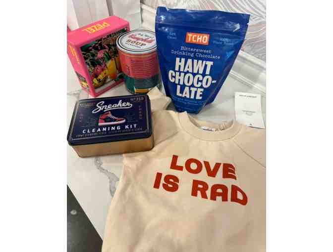 Enjoy this Kids Creation Basket, complete with a Sneaker Cleaning Kit, Jungle Bird 100 Piece Puzzle, Andy Warhol Soup Can Crayons + Sharpener, Love is Rad Sweatshirt (6-9 months), Dolly Is My Spirit Animal Banner, Hawt Chocolate