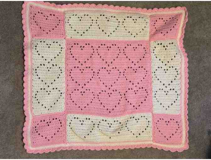 Wrap yourself—or someone special—in love with this beautiful handmade crocheted blanket. Measuring approximately 33” x 31”, it features a soft pink and white color palette with a delicate heart pattern and shell edging. Perfect for keeping a baby cozy, draping over your lap on a chilly evening, or wearing around your shoulders for a touch of warmth and comfort. Every stitch is crafted with care, making this one-of-a-kind blanket a sweet and timeless treasure.