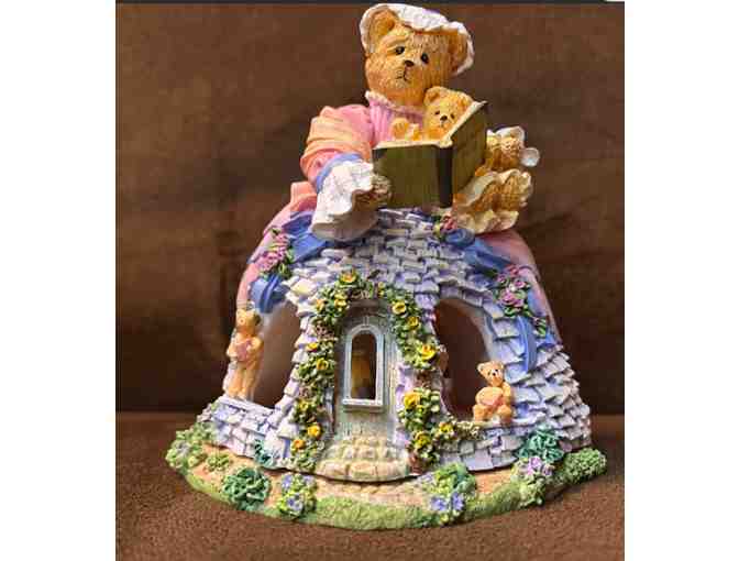 "Abigail — Bedtime Story" depicts a mother bear reading to her cub. They perch atop a cottage with another mother and cub inside. "To Abigail and Sophie, bedtime stories were like a magic carriage that took them down all roads of the imagining."