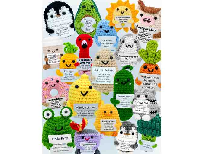 20 positive messages on crochet items - can be used as a conversation starter on your desk or to distribute to colleagues