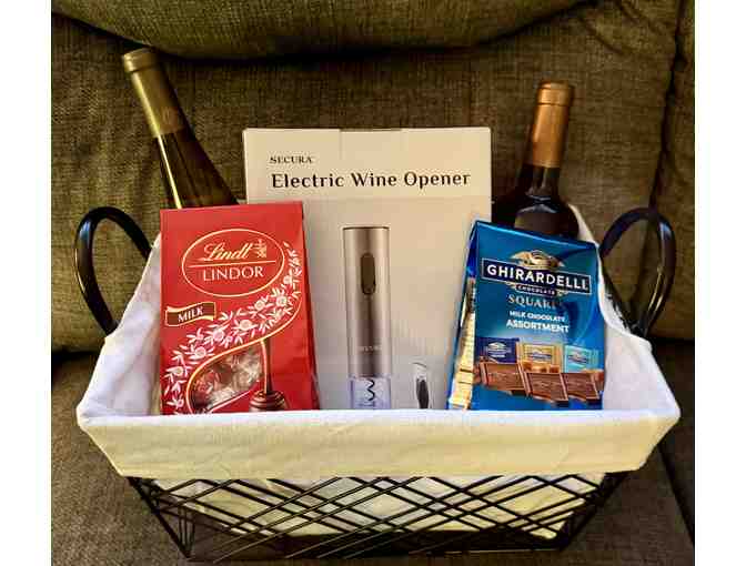 A bottle of red, a bottle of white, an electric wine opener and some chocolate