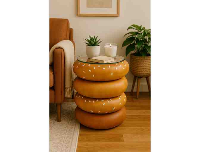 This delightful sesame bagel food stool is 18" high and weighs about 8 pounds. It would enhance any office, children's room, den or living room and is certainly a conversation piece. Have fun with this clever foodstool.