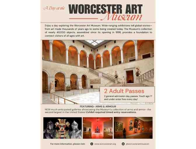 Two (2) adult passes for a day of your choosing at the Worcester Art Museum. Enjoy a day exploring the Worcester Art Museum. Wide-ranging exhibitions tell global stories—from art made thousands of years ago to works being created today. The Museum’s collection of nearly 40,000 objects, assembled since its opening in 1898, provides a foundation to connect visitors of all ages with art. After the museum, enjoy a bit more of what Worcester has to offer!