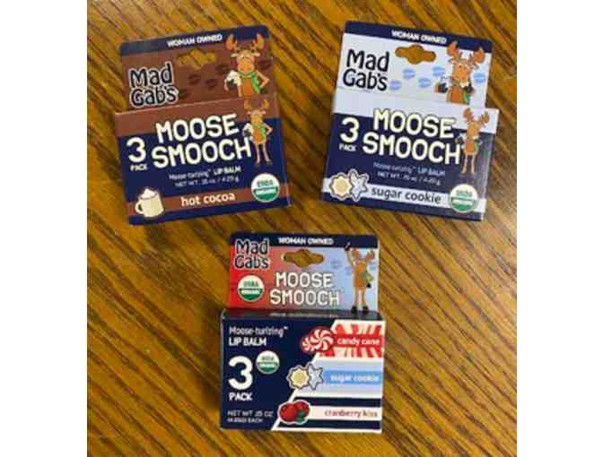 Enjoy this Moose-turizing lip balm package from Mad Gab's. Includes 3 3-packs of Mad Gab's Lip Balms - hot cocoa, sugar cookie, and a combination of candy cane, sugar cookie, anmd cranberry kiss. These are perfect for the winter season!