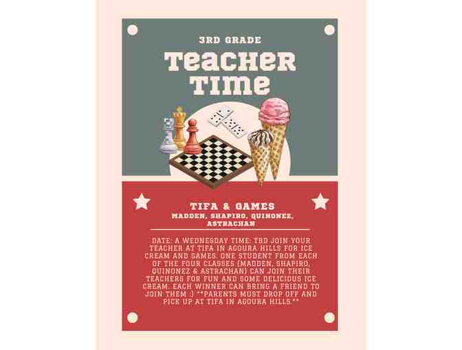 Date: A Wednesday Time: TBD Join your teacher at Tifa in Agoura Hills for Ice Cream and Games. One Student from each of the four Classes (Madden, Shapiro, Quinonez & Astrachan) can join their teachers for fun and some delicious ice cream. Each winner can bring a friend to join them :) **Parents must drop off and pick up at Tifa in Agoura Hills.**