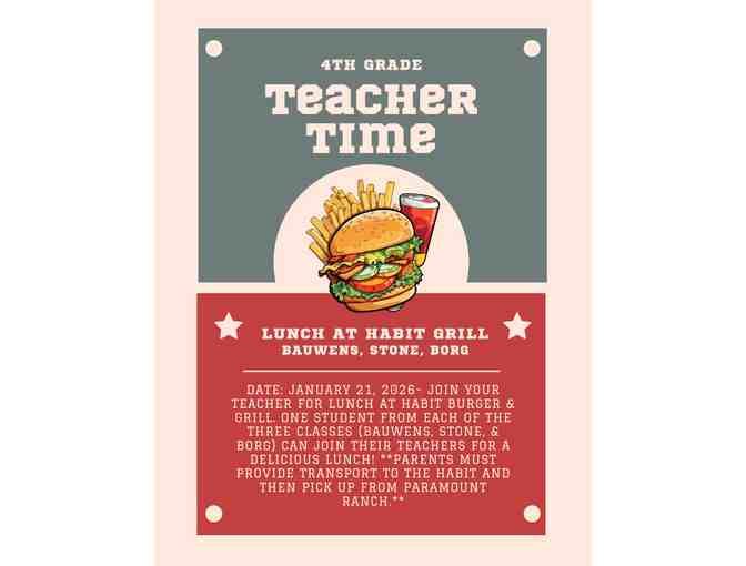 Date: January 21, 2026- Join your teacher for lunch at Habit Burger & Grill. One Student from each of the three classes (Bauwens, Stone, & Borg) can join their teachers for a delicious lunch! **Parents must provide transport to the Habit and then pick up from Paramount Ranch.**