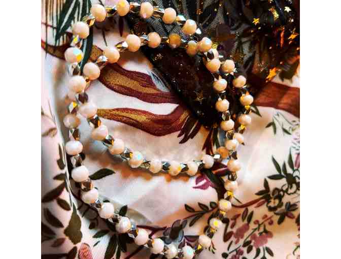Hand beaded sparkling strand on stretch cord. Glass beads. Just a little longer than choker length, so they can discretely peep out from any collar. Starry organza bag makes a nice stocking stuffer or even a tree ornament.