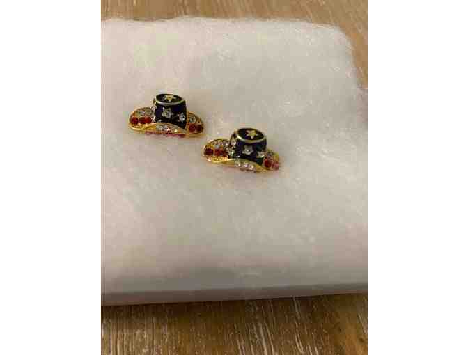 Add some sparkle, spirit, and star-spangled style to your outfit with these dazzling Red, White, and Blue Bling Cowboy Hat Earrings!