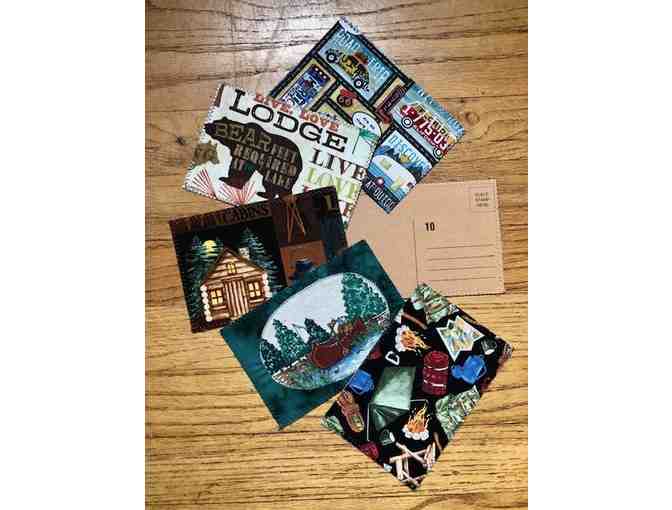 5 handmade fabric postcards with outdoor recreation themes created and stitched by NFCT member Roberta Ponemon.