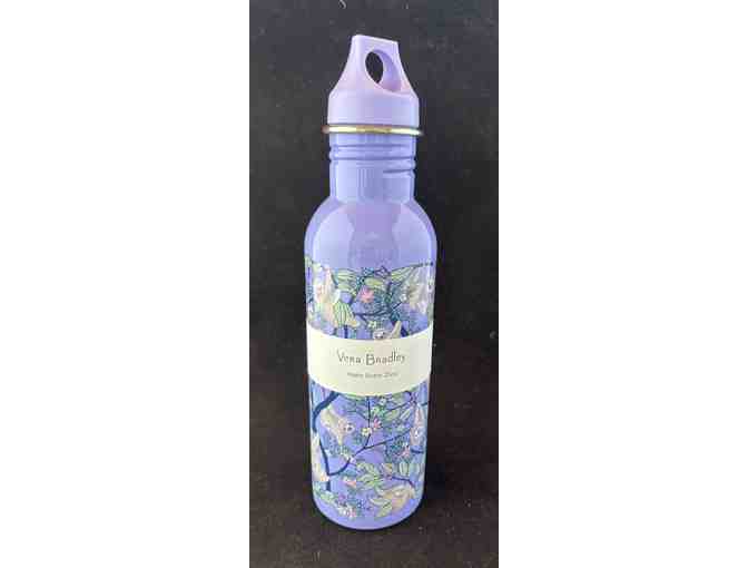 This water bottle by Vera Bradley is 11 inches tall, holds 25 ounces of your favorite beverage. It is rugged stainless steel and is a lovely shade of purple.