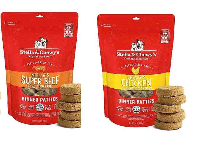 Two large 14 ounce bags of Stella and Chewy dinner patties. One each of chicken and beef. Real raw nutrition in the convenience of freeze-dried patties; serve as is or rehydrate by adding water. Formulated to mimic a canine's natural diet; never contains grains, gluten, fillers, artificial preservatives or colorings. Complete and balanced nutrition is enhanced with probiotics to aid in healthy digestion, perfect for the pup with a sensitive stomach. Proudly made in the USA with ingredients responsibly sourced from trusted and reputable suppliers. Raised without hormones or antibiotics and 100 percent organic-certified fruits and vegetables. Can use as a meal topper over regular food. Expiration May 2026.