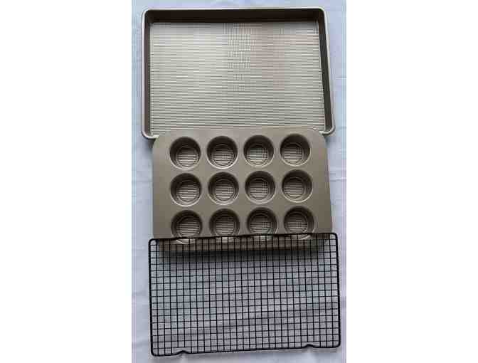 The set includes: 18 x 13 cookie sheet, an 11 x 16 muffin tin (holds 12), and a coooling rack 10 x 16.