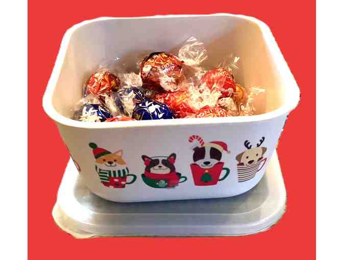 Cute 6x6x3 inch melamine howl-iday dog themed storage bowl with lid. Filled with 8.5 ounces of Lindt assorted truffles in the flavors of milk, dark and white chocolate, as well as caramel milk chocolate and almond butter milk chocolate.
