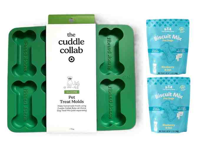 Two 12 ounce bags of blueberry and Oat biscuit mix from The Pawstry Shop. No artificial colors or flavors, safe for both dogs and humans. A 10 x 9 silicone dog bone treat mold. Makes eight 4 x 2 inch treats embossed with the words Snack Bandit.