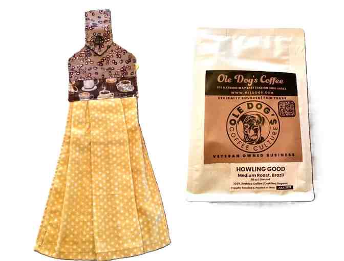 For the coffee and dog lover on your shopping list. Handcrafted coffee themed hanging dish towel with button closure. 10 ounce package of Howling Good medium roast ground coffee by Ole Dogs Coffee. Their mascot is Elsa an adopted Irish Wolfhound. Organic, single-origin coffee (Brazil) with an aroma of part cocoa and caramel, bold tasting notes, and a smooth nutty finish and mild acidity.