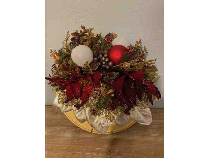 This stunning handmade arrangement features faux poinsettias, pine cones, gold flowers, and sparkling red and white ornaments, all artfully arranged on a shimmering red, gold, green, white, and silver Christmas plate that captures the very essence of the season.