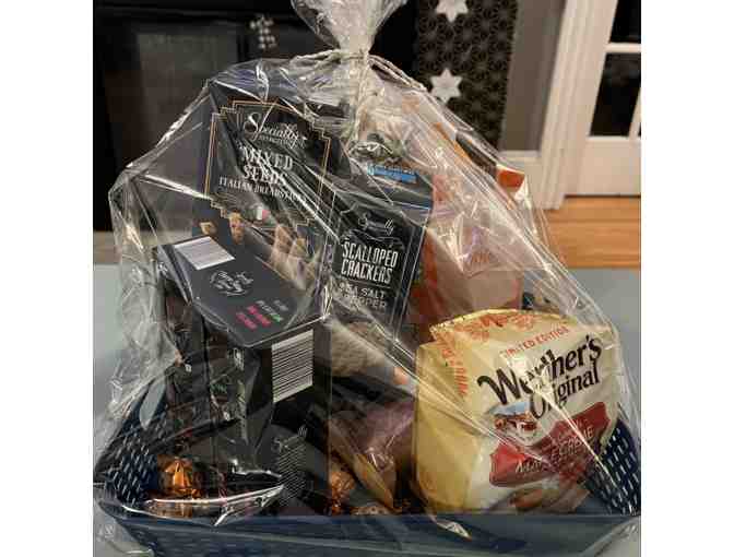 Crackers, assorted jams, salami, candy, and a cheese shaped cutting board - a perfect start to your charcuterie platter! Just add the cheese! 🧀
