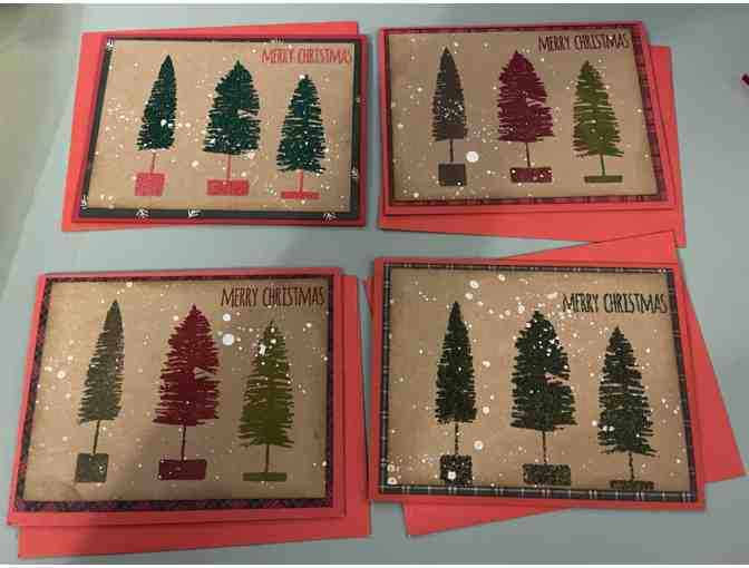 Handmade cards featuring stamped bottle brush tree theme with Merry Christmas greeting (set of 8)