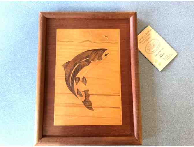Each piece was hand cut, shaved and pieced together to create this stunning image of a trout and dragonly.