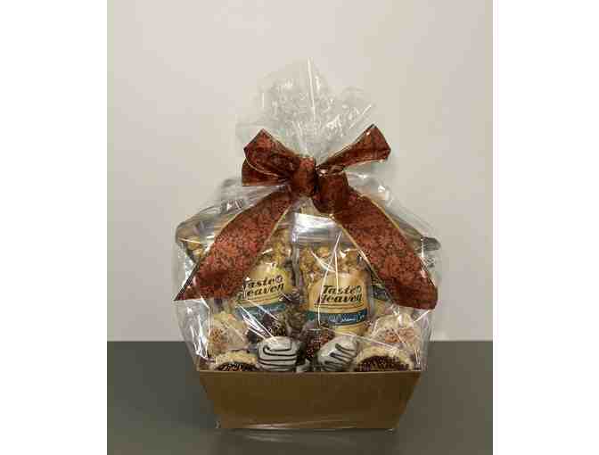 The Taste and See Gift Basket from Taste of Heaven contains one shareable size bag of each of the following: K-zoo Corn, White Cheddar Cheese, Drizzled Caramel Corn, Cheddar Cheese Corn, Michigan Cherry, Sea Salt Dark, and Buttery Caramel Corn. It also contains the following handcrafted confections: two White Chocolate Crispies, two Dark Chocolate Crispies, two Cookie Pops, one Gourmet Pretzel and one Chocolate Dipped Pretzel.