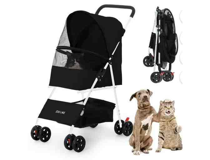 Zoolike 4 wheeled pet stroller for cats and dogs. Crafted from durable Oxford cloth, this pet stroller is water resistant and built to suppport pets up to 30 lbs.