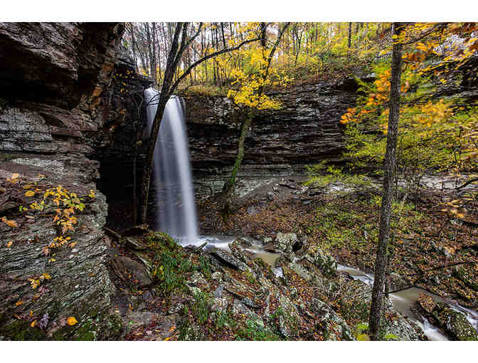 One of a kind 500-piece 15.6-inch by 21-inch jigsaw puzzle of Longpool Falls in autumn. Printed with high gloss finish and sturdy chipboard backing.