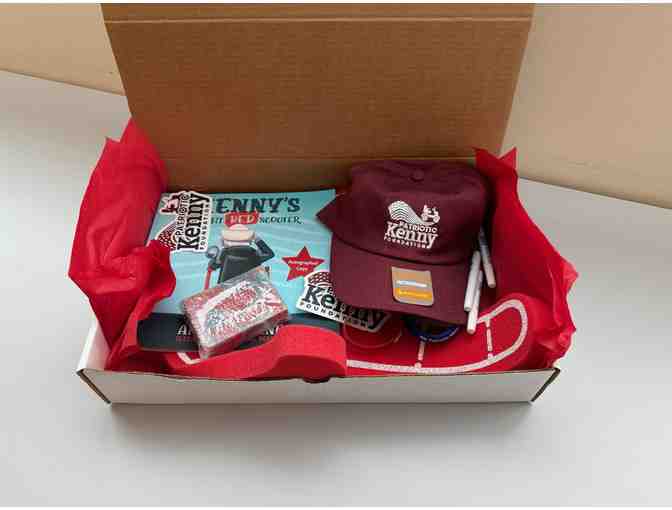 a gift box from Patriotic Kenny filled with soap, a book, baseball hat, stickers, foam finger and bracelets