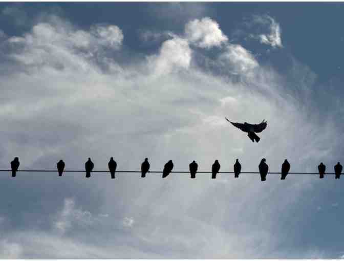 Framed photograph of pigeons on a wire by Mark Greenberg