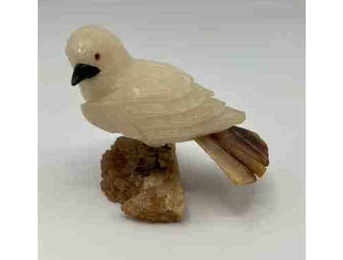 This is a hand-carved gemstone bird figurine made of onyx, perched on a natural mineral base.