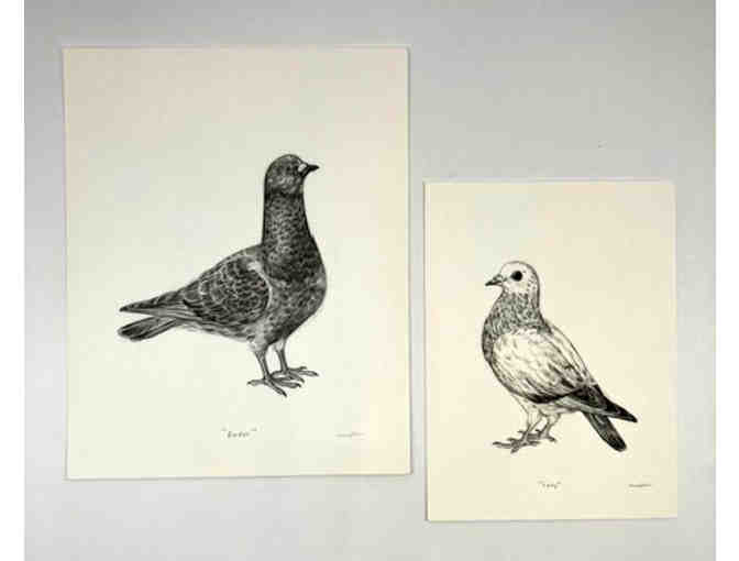 Pen & ink drawings of pigeons 'Barker' & 'Lady' by Nancy Chiu