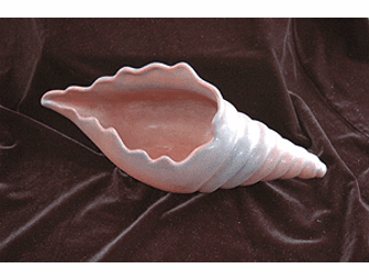 Cornucopia shell form with Persian Rose glaze from Van Briggle Pottery, one of the oldest active art potteries in the U.S. Founder Artus Van Briggle, a top designer for Rookwood, established his own business in Colorado Springs, Colorado in 1899. Examples of his work can be found in the permanent collections of the Metropolitan Museum of Art in New York, the Smithsonian, the British Museum in London and the Louvre. This piece, circa 1950, is marked with the logo, name and finisher's mark "B". Bottom has a thin coat of shellac consistent with pots made from the 1940s - 1960s. Mint condition - no chips, cracks or repairs.