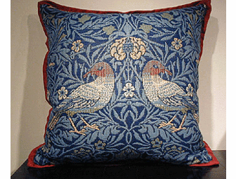 This pillow would make a stunning addition to any home. Originally designed by William Morris for St. James Palace in London in 1875, this reproduction fabric was woven on an 1880's mill at Scalamandre, matching Morris' hand woven original. 19" square, with zipper closure, the back of the pillow is burgundy St.James damask.