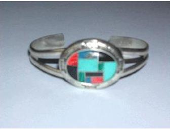 Silver bracelet with semi-precious inlaid stones, in a Southwestern Style.