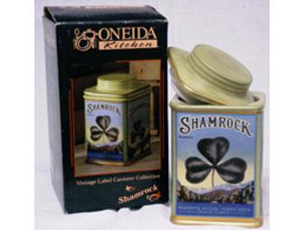 7" tall ceramic canister with "Shamrock" label. Light green in color. Made by Oneida.