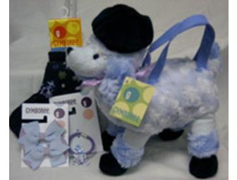 Light blue plush poodle purse. Accessories include navy blue poodle socks (children's size 3/small), light blue/lavender hair barrettes and poodle hair band.