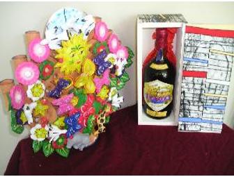 Hand made potery, wall assembly with 6 candle holders by Mexican Artist Raymundo Sesma, who, through his modernity, graphisms, geometry and colors, reflects a great harmony and balance, providing the expectator the sensation of stability in movement.Plus "Reserva de la familia", bottle of Jose Cuervo Special Selection, in a hand painted and autographed wooden box.