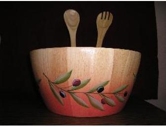 Three piece wooden bowl set. Hand painted on a 12" hardwood salad bowl, with matching servers will add appeal to your special event.