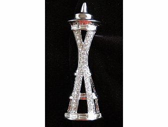 But rhinestones are much more fun! This dazzling version of the Space Needle will be quite the conversation piece when you pin it on your lapel. Measures 3.75" tall in silver metal, and features round brilliant and baguette 'diamonds'!