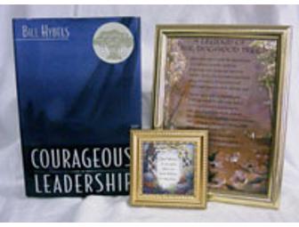 Bill Hybels' "Courageous Leadership" book, plus framed peoms, "A Legend of the Dogwood Tree" and "God Believes In Us".