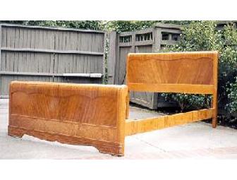 This elegant 1940's double bed, crafted with solid walnut and gorgeous veneers, will bring warmth and charm to your bedroom. Stunning grain, very nice condition and ready to take home.