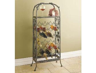 Verona Wine Rack This attractive wrought iron wine rack features scrollwork adorned with leaves across the top. One shelf holds plants or other keepsakes. Finished in a bronze powder coat, this wine rack will hold up to 24 bottles of your favorite vintage. **Bottles of wine and glass illustrated in picture are not included.**