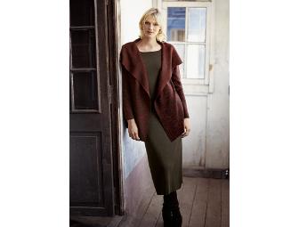 Intricate Persian patterning gives depth to this cape-collared knit jacket, soft and fluid in a blend of 70% baby alpaca, 16% wool and 14% silk. The jacket is relaxed-fit, 29" in length, and styled with an extravagant squared collar that drapes dramatically across the shoulders. The subtle, double-jacquard patterning in heathered bark and Indian red is gorgeous with our fitted, rib-knit u-neck pima dress in mélanged Peat. (Size S)