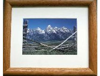 A 5x7 matted and framed photo of the Grand Teton mountains taken from an old homestead along Mormon Row in Grand Teton National Park.