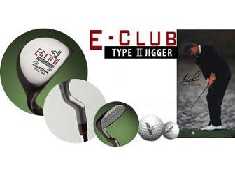 The E-Club has a lofted head of a 5-wood, the weight of a sand wedge and the offset and short-shaft of a putter. With the E-Club, the ball jumps off your clubface, skims over the fairway, rolls like a putt when it reaches the green and makes the most satisfying KERPLUNK! when it rattles the flagstick and drops in the cup. It's great out of the rough, traps, and the woods, too! When a USGA official inspected the E-Club he said, "We may have to make it illegal. It makes the game TOO EASY!" But they didn't! Approved for Play by the USGA. Protected by a U.S. Patent.
