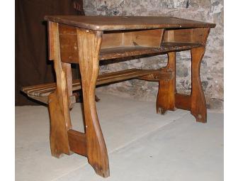Enjoy this lovely turn of the century two-seater school desk in a classic dark oak style. Originally purchased by donor in St. Andrews, New Brunswick, Canada. A great corner curiosity and it makes for great fun and make-believe for those pre-school kids and grandkids..or use it for a quaint display of your own antiquities!