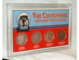 Enjoy this retrospective of quarter coinage featured in a plastic presentation case. Includes a Barber, Liberty, Washington and BiCentennial quarter.